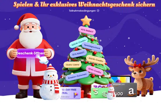 Mit der Veröffentlichung von Edimakor 4.5.0 wird kreatives Arbeiten einfacher, schneller und beeindruckender als je zuvor. Passend zur Jahreszeit hat Edimakor eine festliche Weihnachts-Sales-Promotion gestartet – mit exklusiven Rabatten, kostenlosen Credits und brandneuen KI-Tools, die Bild-, Ton- und Videobearbeitung vollkommen neu definieren.