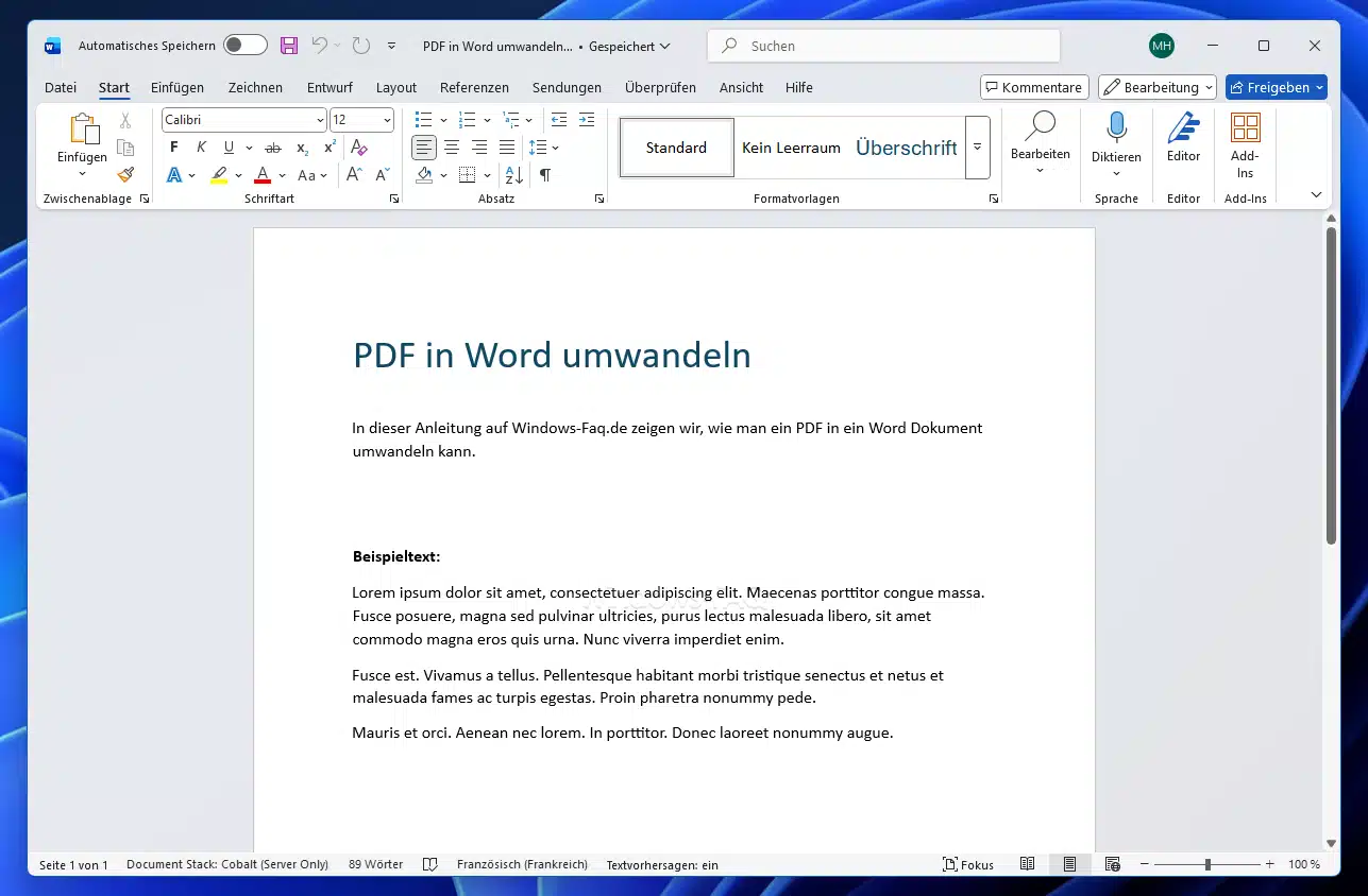 Die wohl einfachste Methode unter Windows 10/11 ist die Konvertierung mit Microsoft Word selbst. Word (ab Version 2013) kann PDF-Dateien direkt öffnen und in ein bearbeitbares Dokument umwandeln. Voraussetzung ist natürlich, dass Microsoft Word auf Ihrem PC installiert ist.