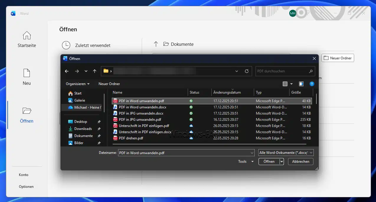 - PDF-Datei auswählen: Gehen Sie zum dem Ordner, in dem sich Ihre PDF-Datei befindet. Wählen Sie die gewünschte PDF-Datei aus und klicken Sie auf „Öffnen“. Alternativ können Sie auch im Explorer mit Rechtsklick auf die PDF „Öffnen mit > Word“ wählen.