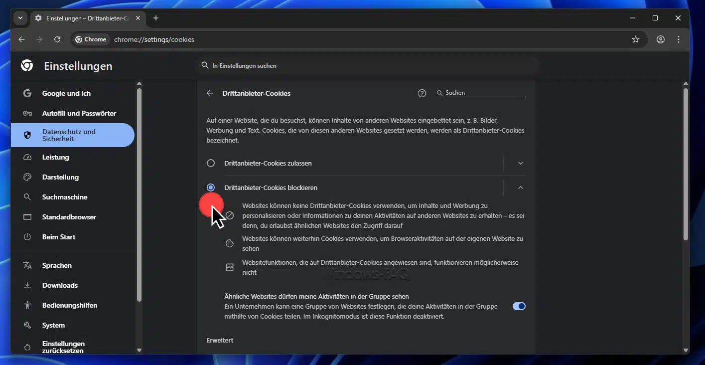 Tipp: In Chrome kannst du ebenfalls einstellen, dass Cookies blockiert werden oder beim Beenden automatisch gelöscht werden. Wenn du beispielsweise keine Drittanbieter-Cookies erlauben möchtest, kannst du unter Einstellungen > Datenschutz und Sicherheit > Cookies und andere Websitedaten die Option wählen, Drittanbieter-Cookies zu blockieren. Möchtest du Cookies komplett deaktivieren (was zu Einschränkungen führt), findest du auch dafür den Schalter in den Cookie-Einstellungen von Chrome. Mehr Details zu diesen Einstellungen zeigt dir unser Beitrag „Cookies deaktivieren im Chrome„.