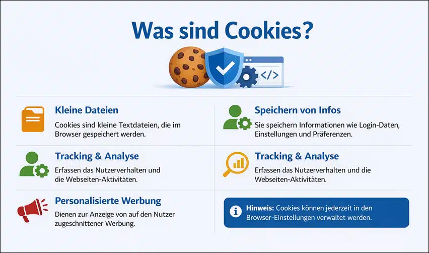 Bestimmt bist du schon oft auf Webseiten gefragt worden, ob du Cookies akzeptieren möchtest. Doch was genau sind eigentlich Cookies? Cookies sind kleine Textdateien, die beim Besuch einer Website auf deinem Computer gespeichert werden. Darin befinden sich Informationen über deinen Besuch, zum Beispiel Login-Status, Deine Spracheinstellungen oder andere persönliche Seiteneinstellungen.