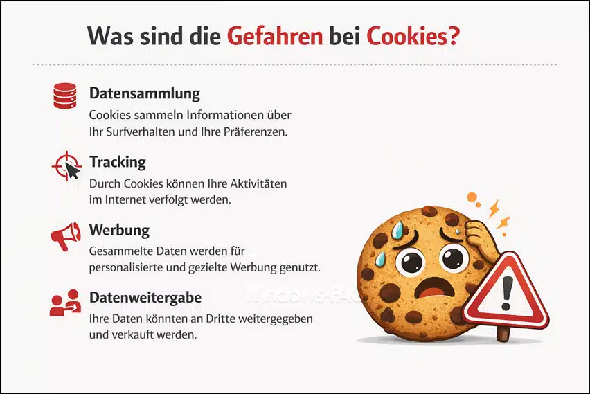 Cookies selbst sind zunächst einmal nicht gefährlich im Sinne von Schadsoftware – es sind nur Textdateien. Allerdings können sie in Bezug auf Datenschutz und Privatsphäre durchaus problematisch werden. Die größten Gefahren bei Cookies entstehen durch Tracking-Cookies. Diese Cookies sammeln Informationen über dein Surfverhalten auf verschiedenen Websites.