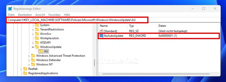 - Registry: Öffne den Registrierungseditor und navigiere zu HKEY_LOCAL_MACHINE\SOFTWARE\Policies\Microsoft\Windows\WindowsUpdate\AU. Setze den Wert NoAutoUpdate auf 0 oder lösche den Eintrag NoAutoUpdate komplett. Starte den PC neu.
