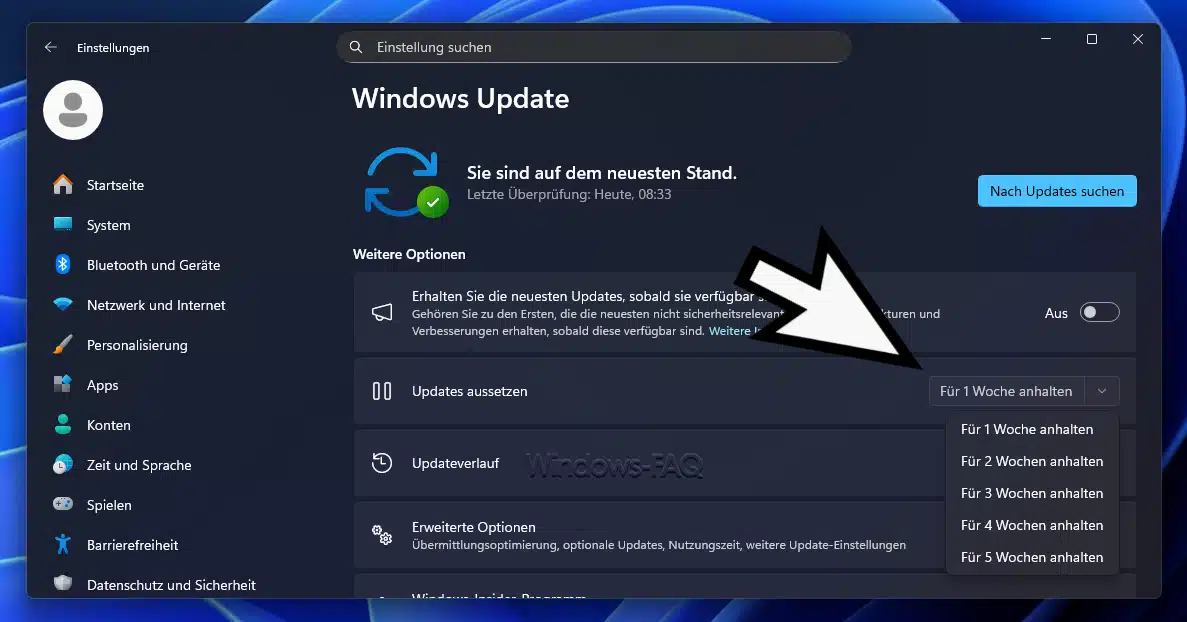 - Wähle danach bitte „Updates pausieren„. Du siehst die Option Updates aussetzen. Wähle hier den maximal verfügbaren Zeitraum (in Windows 11 in der Regel bis zu 5 Wochen).