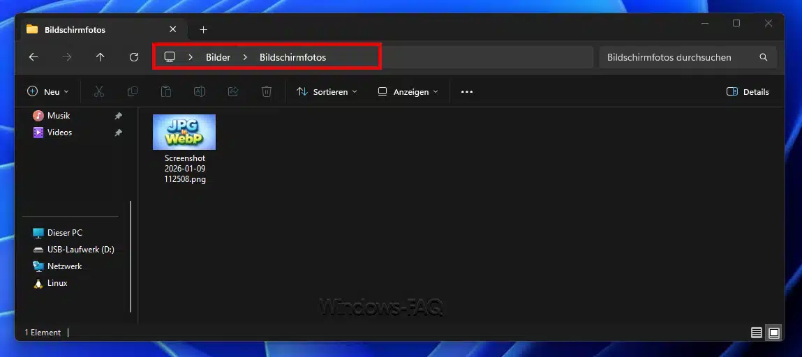Dort sollte dein Screenshot als PNG-Datei erscheinen. Windows nummeriert diese Dateien automatisch (Screenshot (1).png, Screenshot (2).png usw.). Hast du Windows auf Deutsch, kann der Ordner auch Bilder\Bildschirmfotos heißen. In beiden Fällen findest du dort alle automatisch gespeicherten Screenshots.