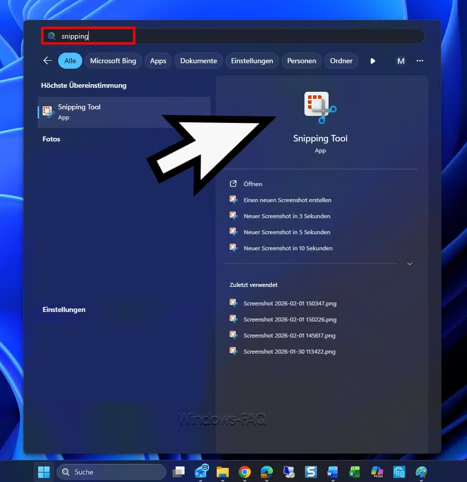 Klicke auf das Startmenü und suche nach „Snipping Tool„, um das Programm zu finden. Klicke auf die App Snipping Tool, um sie zu öffnen. (Unter Windows 11 ist das Snipping Tool auch im Startmenü unter Alle Apps > Zubehör zu finden. Alternativ kannst du es dir für schnellen Zugriff an die Taskleiste anheften.)