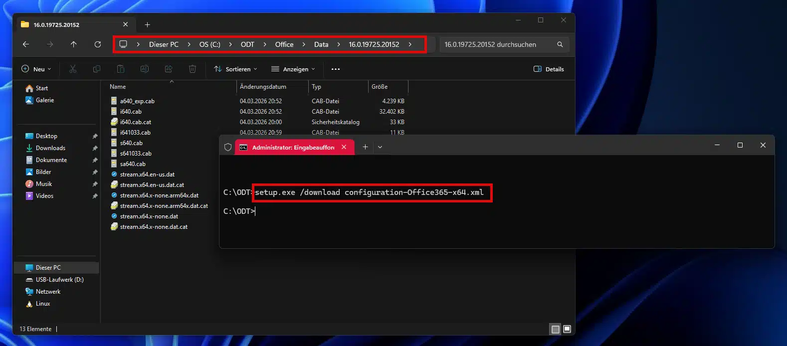 - Bleib in der Admin Eingabeaufforderung im Ordner „C:\ODT„.