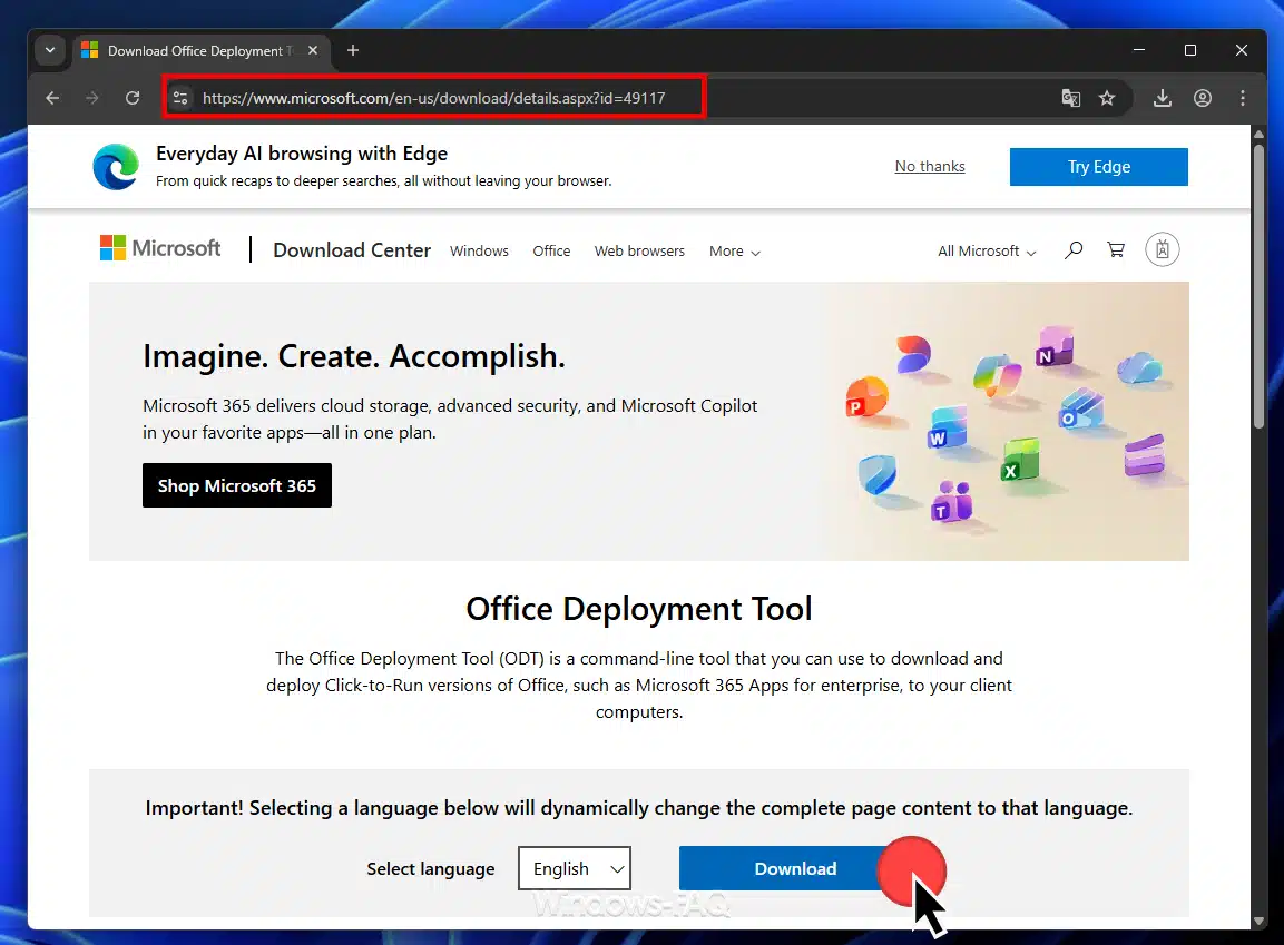 Du lädst das Office Deployment Tool direkt von Microsoft herunter. Es ist kostenlos und steht in verschiedenen Sprachen zur Verfügung. Entscheidend ist nur, dass du wirklich die aktuelle Version nutzt. Auf der offiziellen Download Seite werden Version und Veröffentlichungsdatum gepflegt. Stand 9. Februar 2026 ist dort eine Version 16.0.19628.20192 genannt (dies siehst Du nicht auf dem Bild, das steht weiter unten auf der Webseite).