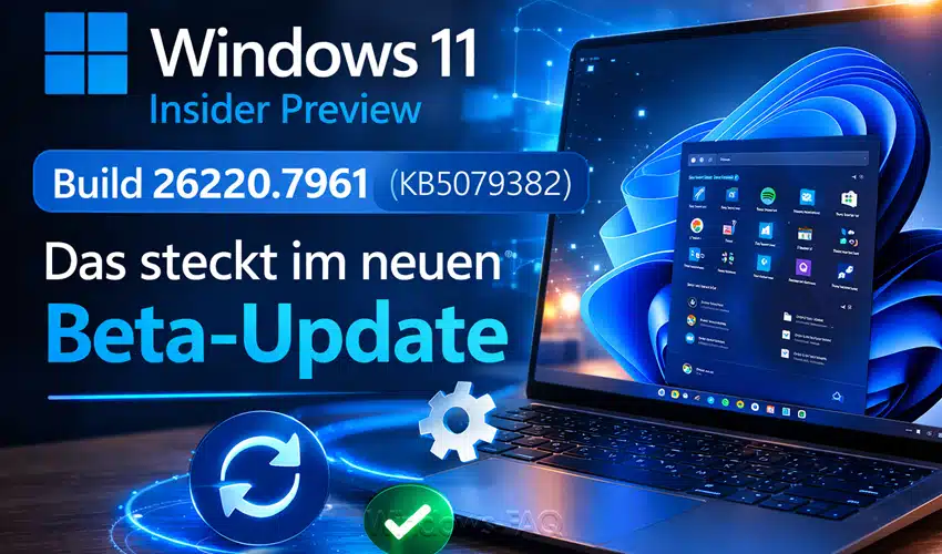 Microsoft hat am 6. März 2026 die Windows 11 Insider Preview Build 26220.7961 (KB5079382) für den Beta-Kanal veröffentlicht. Die Build basiert auf Windows 11, Version 25H2, wird per Enablement Package verteilt und folgt dem bekannten Insider-Modell mit schrittweise ausgerollten Funktionen. Wer neue Features möglichst früh erhalten möchte, muss in Einstellungen > Windows Update den Schalter für die neuesten Updates aktivieren.
