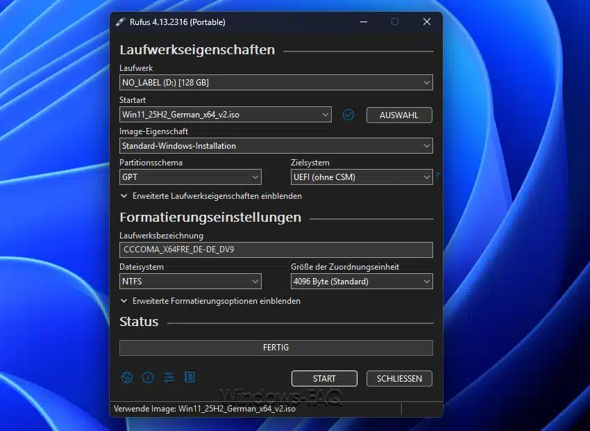 5. Lass Rufus die passenden Standardwerte setzen. Für einen typischen Windows 11 PC ist GPT mit UEFI die richtige Richtung.