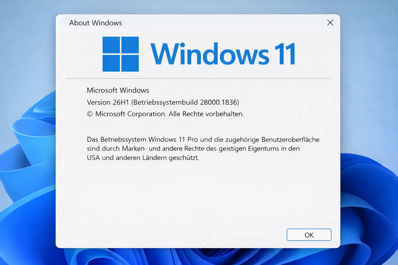 Nach der Installation von KB5083768 wird Windows 11 26H1 auf die Buildnummer 28000.1836 angehoben. Du kannst das ganz einfach mit dem Befehl winver überprüfen.