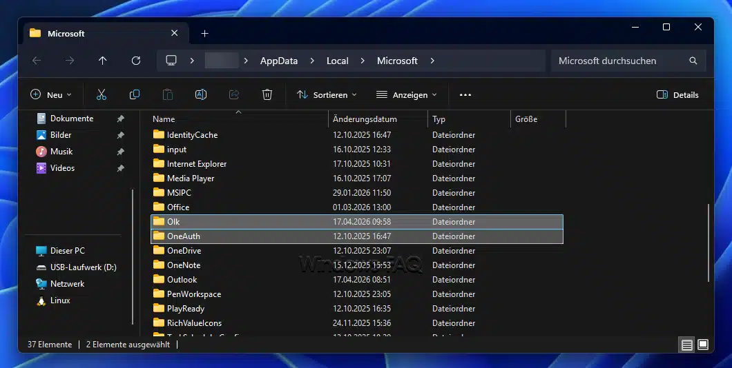 %LOCALAPPDATA%\Microsoft\“ ein. - Suche dort nach den Ordnern „Olk“ und „OneAuth„.