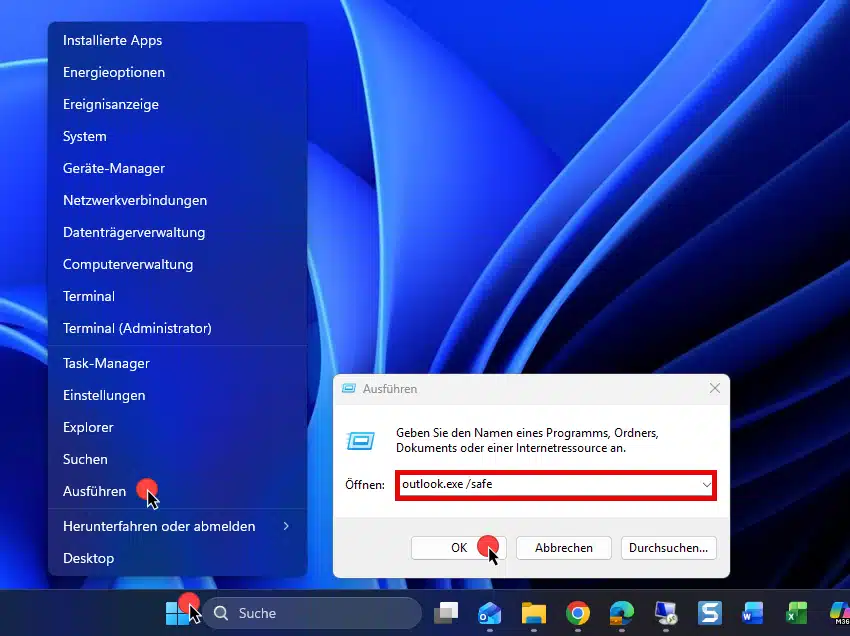 - Gib „outlook.exe /safe“ ein.